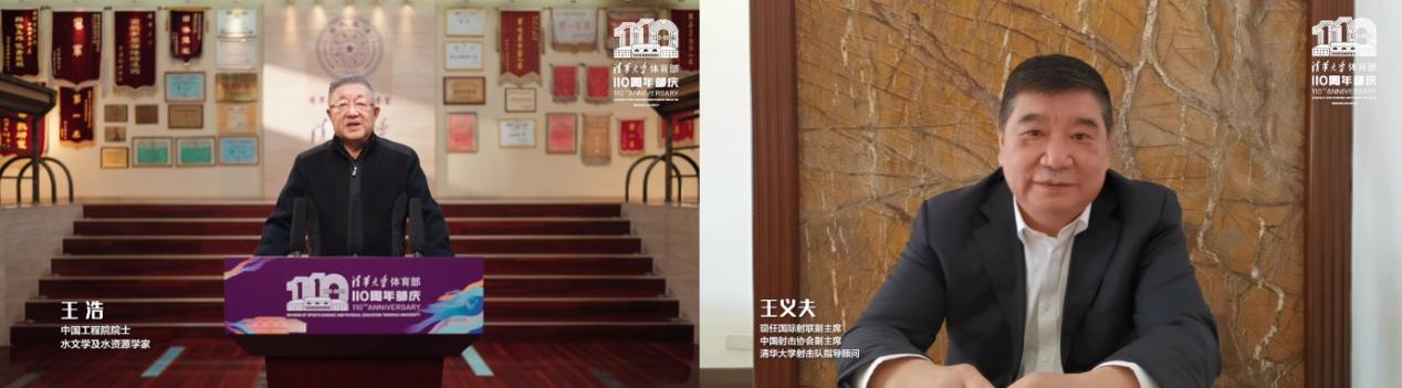 中国工程院院士、流域水循环模拟与调控国家重点实验室主任王浩,国际射联副主席、射击奥运冠军王义夫作为校友代表发言。王浩从体育代表队队员的经历出发,分享了清华体育如何通过价值塑造、能力培养、知识传授,鼓舞和影响自己为祖国健康工作53年的故事。王义夫从射击运动员和清华学生两重身份的经历,分享了在取得奥运冠军后选择来清华深造时度过的充实时光。他们表示,用一生为自己挚爱的祖国做一点事情,正是清华带给他们的热情与理想,也是清华体育奠定的基础。