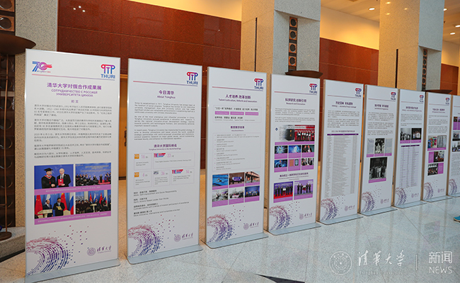 清华大学俄罗斯研究院成立仪式同期还在主楼大厅举行了“献礼中俄建交70周年——清华大学对俄合作成果展”,包括人才培养、学科建设、人文交流、科技合作及战略研究等5个篇章。
