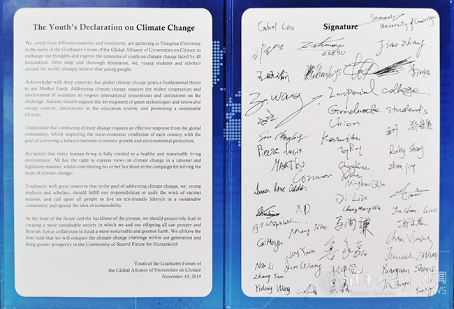 经过圆桌会议的交流讨论,参会代表共同形成了《气候变化青年宣言》。宣言表达了世界青年对气候变化问题的共同关注,呼吁青年学生和学者在解决气候变化问题的进程中团结各方、贡献力量。参会代表在宣言中提出“让我们携手共建一个发展更加可持续、更加绿色的地球吧!我们坚信,气候变化问题将在我们这一代被解决,人类命运共同体在我们这一代会更加繁荣!”