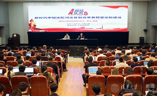 清华新闻网11月7日电(记者 李晨晖 摄影 李派 孙若丰)11月6日下午,中国政法实务大讲堂走进清华大学。最高人民法院党组书记、院长周强围绕“新时代中国法院司法体制改革和智慧法院建设”作专题讲座,与清华大学600多名师生互动交流。中央政法委秘书长陈一新,副秘书长景汉朝、王洪祥、雷东生,最高人民法院党组成员、政治部主任马世忠和教育部有关部门负责人出席。清华大学党委书记陈旭主持讲座,副校长吉俊民、相关部处和院系负责人与师生共同聆听讲座。