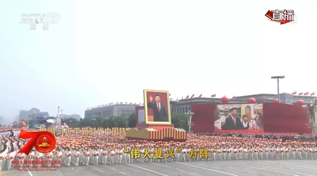 10月1日12点02分,作为国庆群众游行的第18个方阵,“伟大复兴”方阵走过天安门广场。他们簇拥着习近平同志巨幅画像和标语,挥舞着鲜艳的花束,高喊着“祖国万岁,青年加油”的口号,向世界展示清华青年、中国青年的飒爽英姿;高喊着“总书记好”,表达了对以习近平同志为核心的党中央的衷心拥护和爱戴。