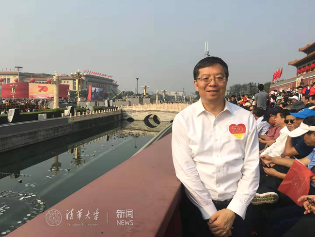 国庆日的天安门广场,观礼台上,清华大学党委书记陈旭、校长邱勇、副校长尤政等多名教师受邀现场观礼,80余名师生组成的合唱大队,140余名清华大学志愿者在现场沐浴感动与自豪。