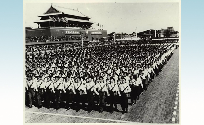 1959新中国成立10周年,一万多名清华师生参加到群众游行中,并进行了丰富多彩的展示,包括“原子反应堆”和“雷达”模型等。从1959年开始,中央工艺美术学院(清华大学美术学院前身)每年国庆节会派部分教师,深入参与到游行总指挥部和分指挥部进行美术设计工作。