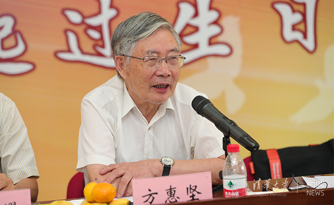 听了师生代表们的发言,方惠坚深有感触地回顾了自己在清华的学习工作经历,以及清华的发展变化所折射的中国高等教育的沧桑历程。方惠坚说,自己1950年进入清华学习,当年国庆时有幸参加了新中国成立一周年群众游行。1949年,全国只有200多所大学,高等教育在学总规模11.7万人;到去年,全国高等学校已有2660多所,在校生总人数达3830多万人,中国高校的数量和质量都有了大大提升。解放初期,清华大学是一所综合性大学;1952年全国高等院校院系调整后,清华大学成为一所多科性工业大学;改革开放以来又发展成为综合性、研究型、开放式的大学;如今学校发展迅速,正朝着建设世界一流大学的目标奋力迈进,这正是大家由衷感到欣慰的原因。