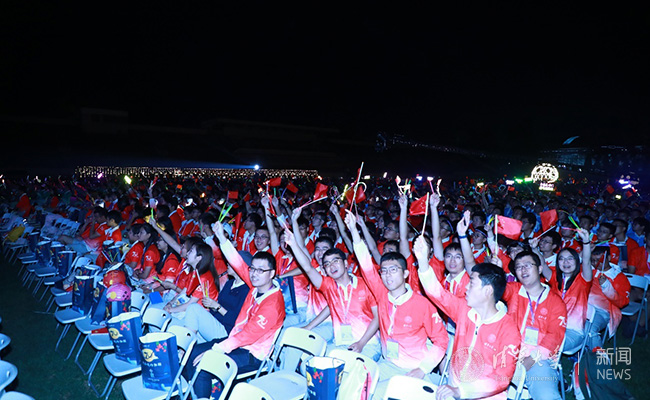 接下来,来自港澳地区的学生上台演唱了《东方之珠》与《七子之歌》,国际学生演唱了经典曲目《茉莉花》。在这深情的旋律里,台下同学一齐挥舞手中的五星红旗。此时,一直藏在云层后的圆月跃然而出,观众席的同学们抬头望月,不禁感慨万千。来自学生艺术团舞蹈队的一支《骤雨新荷》更是将晚会的氛围推向了高潮。