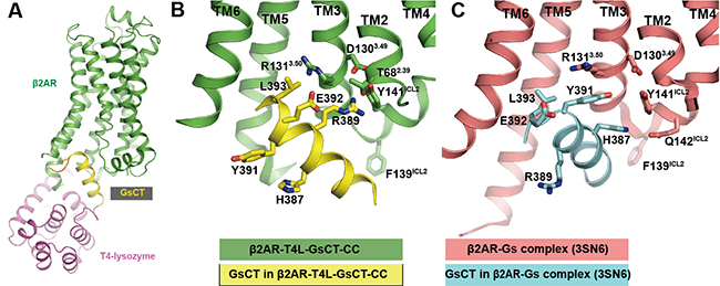 图2 beta2 肾上腺素受体与Gs蛋白C末端的14个氨基酸(GsCT)融合蛋白的晶体结构(A),在该结构中,带电荷的氨基酸E392Gs和R389Gs与β2AR相互作用,而Y391Gs和H387Gs不参与β2AR的相互作用(B)。这一相互作用模式与β2AR-Gsempty(PDB: 3SN6)结构里观察到的方式相反(C)