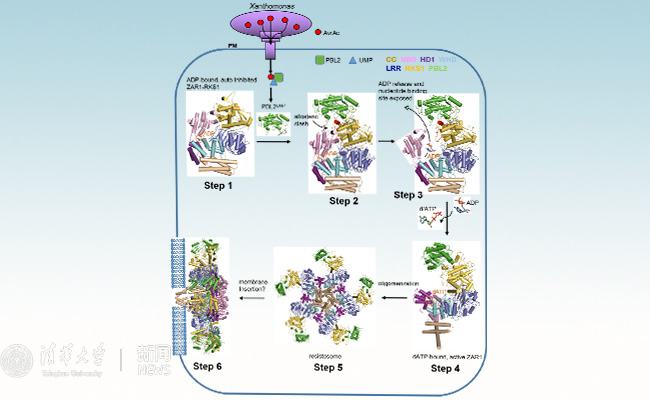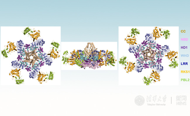 清华新闻网4月5日电 在长期对抗病原生物的过程中,植物进化出了复杂高效的两层免疫系统,用于识别各种病原微生物、激活防卫反应保护自己。处于两层免疫系统的核心是植物细胞内数目众多的抗病蛋白,它们既是监控病虫侵害的哨兵,也是植物动员高效防卫系统的指挥官。抗病蛋白被发现及在植物育种中大量应用已有20多年,但人们对其发挥作用的分子机制仍不清楚。清华大学柴继杰团队、中国科学院遗传与发育生物学研究所周俭民团队、以及清华大学王宏伟团队最近的联合研究,在植物免疫研究领域取得历史性的重大突破。合作团队发现由抗病蛋白组成的抗病小体并解析了其处于抑制状态、中间状态及五聚体活化状态的冷冻电镜结构,从而揭示了抗病蛋白管控和激活的核心分子机制。相关成果以两篇长文(Research Article)形式,分别以“病原蛋白诱导的ADP解离启动植物抗病蛋白”(Ligand-triggered allosteric ADP release primes a plant NLR complex)和“植物抗病小体的重组和结构功能基础”(Reconstitution and structure of a plant NLR resistosome conferring immunity)为题目,于2019年4月5日发表在国际权威学术期刊《科学》(Science)上。《科学》杂志同期发表了国际植物抗病研究权威科学家Jeffery Dangl和Jonathan Jones撰写的题为“耀眼的五星:植物抗病小体”(A pentangular plant inflammasome)的专文评述,高度评价这一重大突破性成果。