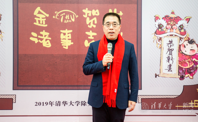 邱勇在晚会上的致辞中说,“一入清华门,就是清华人;吃过年夜饭,就是一家人”,他代表学校向广大师生员工、广大校友拜年,祝大家新春快乐!邱勇回顾了清华大学过去一年各方面工作取得的新进展,包括深入推进综合改革,确立了“三位一体”的教育理念和培养模式,持续推动学科交叉,全面推进新的校园规划等。他说,2018年清华大学作为第一单位获得国家科技奖15项,不仅创造了清华大学的记录,也创造了中国高校的记录;学生超算团队再次包揽三大国际超算赛事冠军;女篮再次获得全国大学生篮球联赛冠军,这些重要事情都令清华人振奋。他还特别提到,今天晚上参加除夕晚会的同学中,超过一半的是国际学生。2018年清华大学全球战略实施迈上新的高度,清华大学东南亚中心和拉美中心相继成立。在刚刚过去的2019年1月,清华在达沃斯倡议成立“世界大学气候变化联盟”,清华的国际影响力也持续提升,他说,更多的国际学生来到清华学习,同时也在世界各地听到越来越多清华学者的声音。”冬尽今宵促,年开明日长“,在新的一年,他期待大家能够携手创造出更加精彩的明天,让本命年的清华呈现出更大的生机与活力。