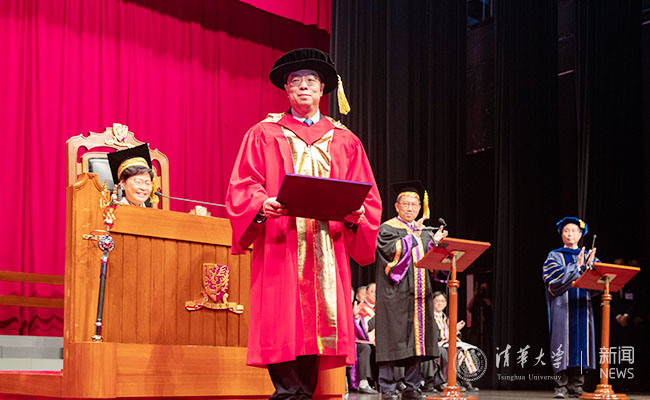 香港中文大学中国语言及文学系主任邓思颖宣读了对邱勇校长的赞词。他在赞词中说:从当年刚踏入校园寻梦的学子,到今天带领全校师生寻梦的校长,邱勇在清华学习、工作35年,可谓名副其实的“老清华”。他致力促进科研、材料开发、成果转化,开创了新型交叉学科研究,打通了科研通向产业化的道路;他对学子循循善诱,启迪人心;就任校长后,他继续推动和巩固清华与香港中文大学之间紧密的合作关系。“邱勇教授言传身教,春风化雨,孜孜不怠,力求突破。提倡学科交叉研究,推动学术与产业的结合,带动社会新风气,视野高远,胸襟广阔,海纳百川,故能成其大。为学为人,充分体现了清华大学‘自强不息,厚德载物’的精神,身体力行,躬先表率。”