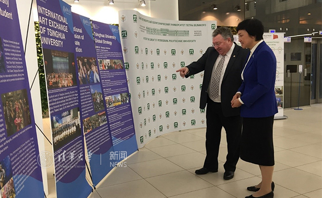 “清华大学日”期间,清华大学在圣彼得堡理工大学举办国际教育展,集中展示学校立足中国、面向世界的发展成就,介绍实施全球战略、推进国际化办学的重点举措。同时举办两校交流与合作专题展览,回顾两校交流合作的历史与成就。陈旭与卢德斯科伊校长及该校师生共同观看展览,并与现场的中俄两国学生交流互动。