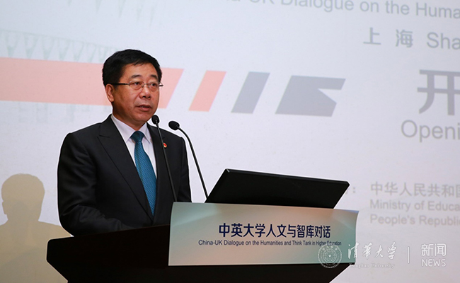 清华新闻网12月7日电(记者 李 婧) 12月6日上午,作为“中英高级别人文交流机制第四次会议”的配套活动,由清华大学、复旦大学、英国大学联盟(Universities UK)共同主办的“中英大学人文对话”论坛在上海拉开帷幕。中华人民共和国教育部部长陈宝生、英国文化教育协会首席执行官邓克然爵士(Sir Ciarán Devane)出席开幕式并致辞。上海市政府副秘书长宗明出席开幕式。清华大学校务委员会主任陈旭、复旦大学校务委员会主任焦扬、英国大学联盟首席执行官尼古拉·丹德里奇(Nicola Dandridge)、英中贸易协会总裁戴仲森(Stephen Phillips)分别在论坛上作主旨发言。论坛由清华大学世界文学与文化研究院院长、外国语言文学系主任颜海平主持。