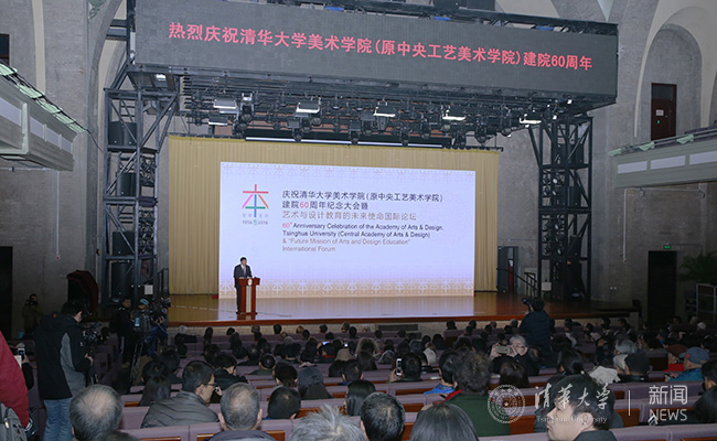邱勇在致辞时指出,作为清华大学美术学院前身的中央工艺美术学院从成立之初就树立了为国家经济文化建设服务、为人民的“衣食住行”艺术化服务的办学理念,先后完成了人民大会堂、中国革命和历史博物馆的室内装饰设计与首都国际机场、北京地铁站台的壁画设计等工作,汇集了张光宇、庞薰琹、雷圭元、祝大年、张仃、吴冠中等学贯中西的名师大家,为新中国培养了数以千计的优秀人才,推动中国艺术设计教育从垦荒走向繁荣,并使艺术设计成为当今社会创新驱动的一支重要力量。1999年并入清华后,在秉承原有办学优势及学术传统的基础上开启了新的篇章。不但为清华增加了浓厚的人文气息和艺术氛围,还大力推动了艺术与科学的融合,与多个院系开展了不同形式的教学与科研合作,积极参与艺术博物馆建设和新雅书院的教育教学,在艺术教育方面发挥了独特的重要作用,在人才培养、学术研究、学科建设、队伍建设等方面都不断取得新的成果。