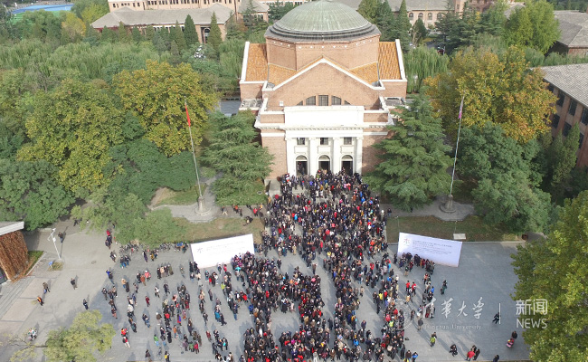 纪念大会在隆重热烈的气氛中落幕。会后,所有与会嘉宾、校友在大礼堂外拍摄无人机合影留念。