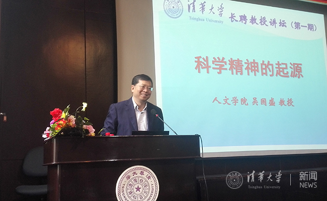 清华新闻网10月15日电 (记者 刘蔚如)10月14日上午,“清华大学长聘教授讲坛”制度设立后的第三天,科技哲学领域著名学者、人文学院新引进的长聘教授吴国盛在图书馆报告厅向师生做了一场题为“科学精神的起源”的精彩报告。这也是“清华大学长聘教授讲坛”首场报告。校长邱勇为吴国盛颁发了长聘教授证书并致辞。人文学院教授汪晖主持本期讲坛。