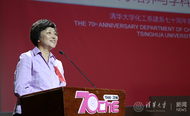 陈旭在致辞中代表学校向各位来宾及长期支持化工系发展的各界人士表示衷心感谢,向化工系全体师生员工和广大校友表示热烈祝贺。她说,在跨越70年的办学历程中,清华大学化工系始终围绕祖国和人民的需要,坚持从我做起、从现在做起,团结拼搏、艰苦奋斗,为国家建设、科技发展和产业振兴作出了重要贡献,毕业生中涌现出一批治学、兴业、治国的杰出人才。当前,清华正在新百年的历史新起点上加快建设世界一流大学,希望化工系牢记习近平总书记对清华大学和化工系提出的殷切期望,紧紧抓住国家加快转变经济发展方式、大力实施创新驱动发展战略的大好时机,进一步解放思想,实事求是,面向未来、面向世界,改革创新,锐意进取。希望化工系始终围绕人才培养根本任务,深入探讨长远发展战略,创新发展思路和模式。既立足国际发展前沿,又引领产业行业发展,把“中国特色”与“世界一流”有机统一在办学实践当中,在推进世界一流学科建设上实现新突破,为我校迈向世界一流大学前列,为国家发展、人民幸福、人类文明进步作出新的更大贡献。