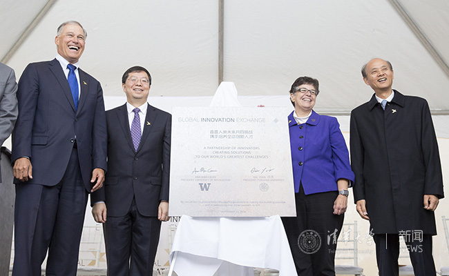 从左至右:华盛顿州州长杰伊·英斯利、清华大学校长邱勇、华盛顿大学校长安娜·玛丽·科斯、中国驻旧金山总领事罗林泉