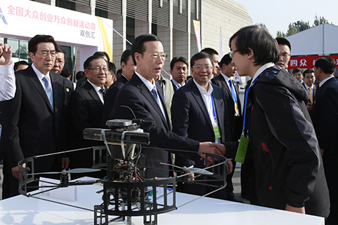 张高丽副总理与“自主视觉导航无人机”项目负责人、清华大学自动化系博士生李修亲切握手。