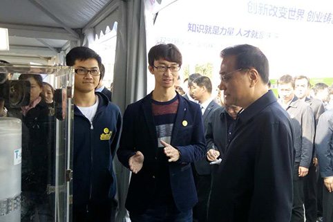李克强总理参观清华学生创新创业项目“淘氪湿式智能空气净化器”,和项目发起人、清华大学机械工程系博士生赵龙亲切交流。