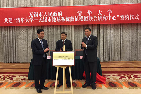 无锡市市长汪泉、清华大学副校长尤政、科技部前部长徐冠华院士为“清华大学-无锡市地球系统数值模拟联合研究中心”揭牌。