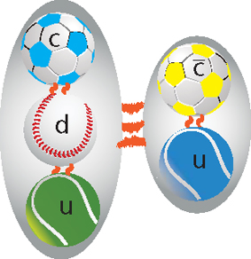 五夸克态的两种可能解释。左图示意紧密型五夸克态,右图示意分子型五夸克态。