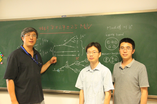 清华成员(左起:高原宁、张黎明、杨振伟)在探讨五夸克态产生和衰变机制。