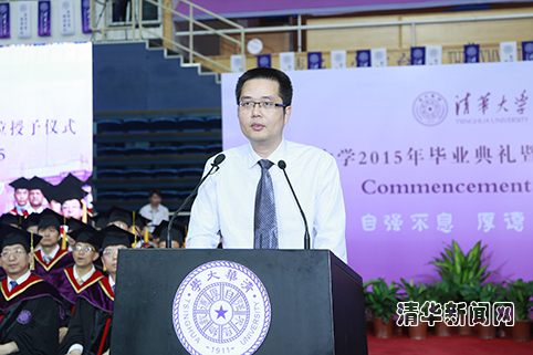 新闻学院2015届博士毕业生沙垚作为毕业生代表发言。他回顾了2005年考入清华园来的求学历程,讲述了自己进行社会调研的经历,还分享了对于“研究”和“传统文化”的理解。他说,今天同学们在清华毕业,但这也只是一个“小清华”,在祖国辽阔的土地上还有一个“大清华”,清华人以天下为己任,将自己的人生与天下兴亡结合起来,从顺应到引领历史的潮流,进而成就一番事业。