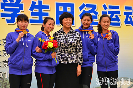 陈旭为夺得女子4x400m接力冠军的清华运动健儿颁奖。