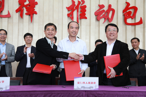 清华大学常务副校长程建平、厦门市副市长黄强和台湾新竹清华大学校友会副理事长蔡能贤,代表三方签订联合建设清华海峡研究院协议书。