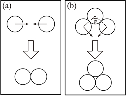 图1.(a)漂浮在液体表面的两颗粒由于液桥作用,自发团聚到一起;(b)同理,漂浮的三颗粒应自发趋向于密堆积;(c)实际观察到的一个漂浮颗粒聚集,含许多缺陷(洞)。