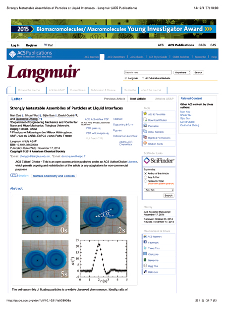 这篇刚发表的研究论文 Strongly Metastable Assemblies of Particles at Liquid Interfaces(液面漂浮颗粒超强的亚稳态自组装),成为了2014年12月5日的ACS编辑们的举荐(ACS Editors’ Choice),放在ACS(美国化学学会)杂志网站(pubs.acs.org)作为头条新闻展示一周,并成为永久免费浏览资源。