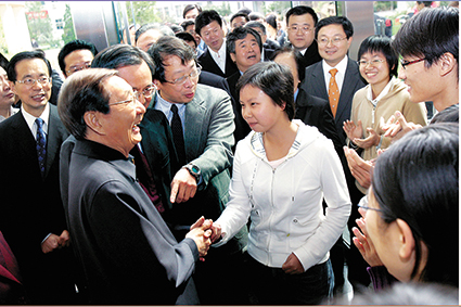2007年10月10日,朱镕基回到经管学院,与大一新生戴天骄握手。