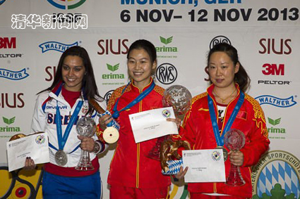 图为易思玲(中)获得射击世界杯总决赛金牌。