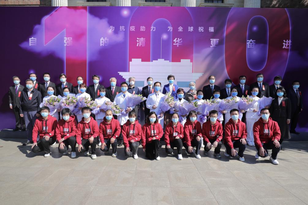 在此次抗击疫情的战役中,北京清华长庚医院支援武汉医疗队踊跃请战,以勇气和责任诠释了医者仁心。活动上,与会校领导为他们一一颁发纪念牌并献上鲜花。