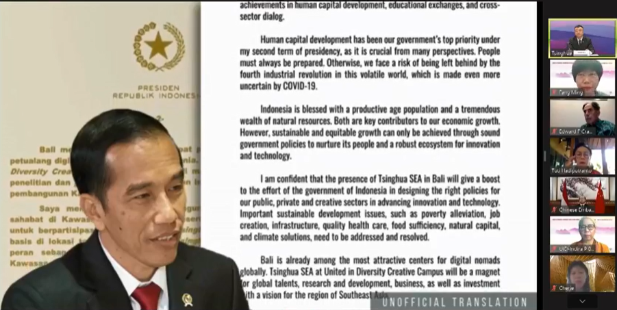 印度尼西亚总统佐科·维多多在贺信中赞扬了清华大学东南亚中心在人力开发、教育交流、跨行业对话等方面取得的卓越成就。他相信,清华大学东南亚中心将继续在连接印尼、中国、东南亚地区及更广泛地区方面发挥积极的促进作用。