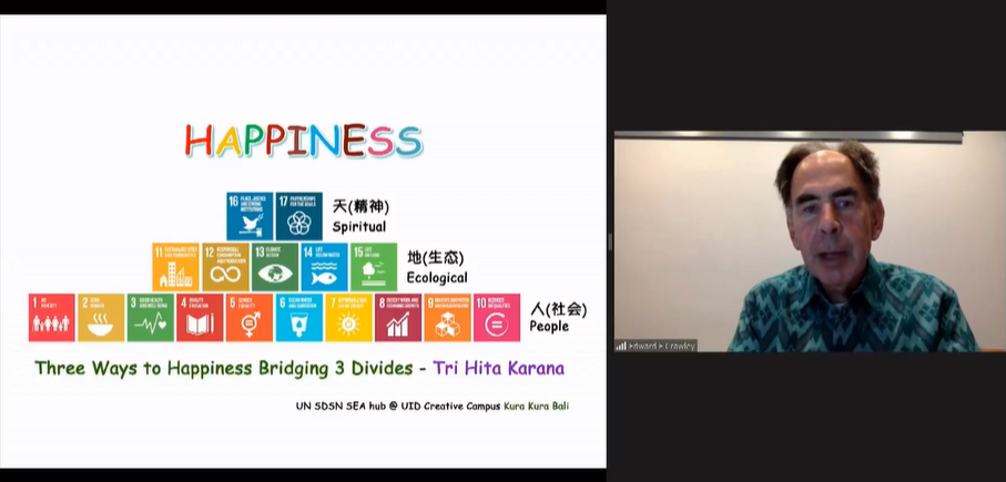 清华大学东南亚中心学术主任爱德华·克劳利教授以“幸福数字化转型:城市、系统和产品”为演讲题目,从可持续发展目标和人类幸福感两个维度,剖析了巴厘岛(Tri Hita Karana)“天地人和”的传统幸福哲学。他强调了“天地人和”的重要性,并表示建立清华大学东南亚中心的意义之一正是建立社会的信任感,从而推动地区乃至世界的公众健康和经济发展。他还结合数字化转型,提供了关于如何建设幸福数字城市、开展相关科创人才培养项目的建议。