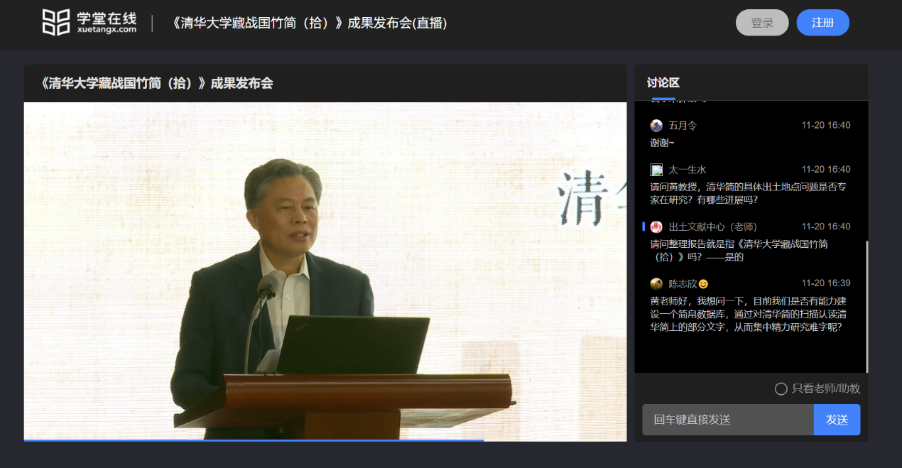 清华新闻网11月23日电11月20日,《清华大学藏战国竹简(拾)》成果发布会首次在清华大学出土文献研究与保护中心新址召开。由于疫情防控的特殊情况,清华大学出土文献研究与保护中心、中西书局与“学堂在线”合作,开启了清华简整理报告发布会全球直播,这也是出土文献整理报告发布形式、传播渠道的创新开拓之举。线上近4500人次观看发布会,许多海内外著名学者通过“学堂在线”平台全程观看了发布会。