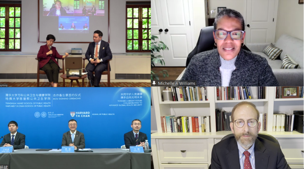 2021年12月2日,在杨斌和哈佛大学教务长艾伦·嘉博(Alan M. Garber)的共同见证下,卫健学院院长陈冯富珍代表卫健学院与哈佛大学陈曾熙公共卫生学院院长米歇尔·威廉姆斯(Michelle A. Williams)共同签署合作备忘录。此次合作不仅标志着清华大学与哈佛大学在公共卫生领域的合作全面启动,更是新冠肺炎疫情全球大流行之际,中美两所知名高校共同推动全球公共卫生安全的历史性举措。