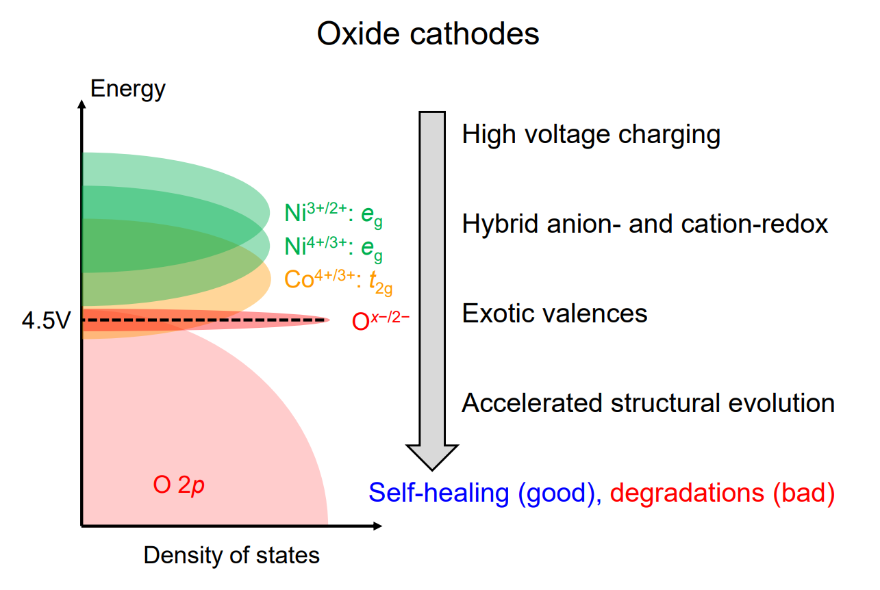 图1.高电压氧化物正极中的奇异价态、加速的结构演化、自修复和衰减现象