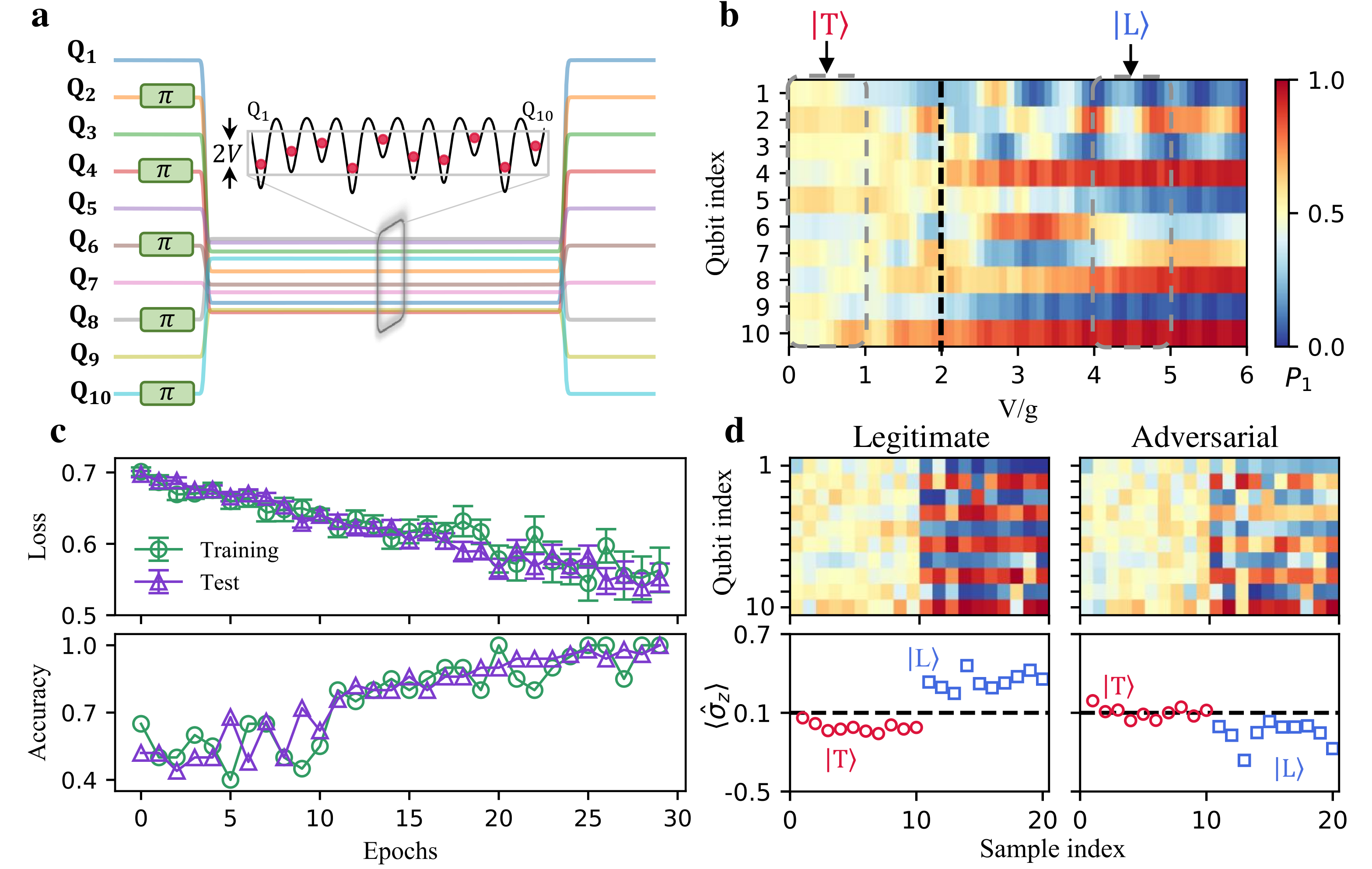 在量子机器学习领域,近年来的理论工作展示了在某些特定的任务下,量子分类模型和生成模型相对于经典模型具有可证明的、有复杂性理论保证的优势。最近两年,量子对抗机器学习的概念也被提出并受到了广泛关注。然而,在当前中等规模带噪声(NISQ)量子设备上演示量子学习模型面对对抗攻击的脆弱性和防御手段还面临诸多挑战。该研究中,清华大学交叉信息研究院邓东灵团队设计了处理经典数据和量子多体态数据的学习模型,并与浙江大学超导量子计算团队合作,首次在量子设备上成功实现了高维数据的学习、对抗攻击脆弱性的揭示以及相应防御手段的展示。