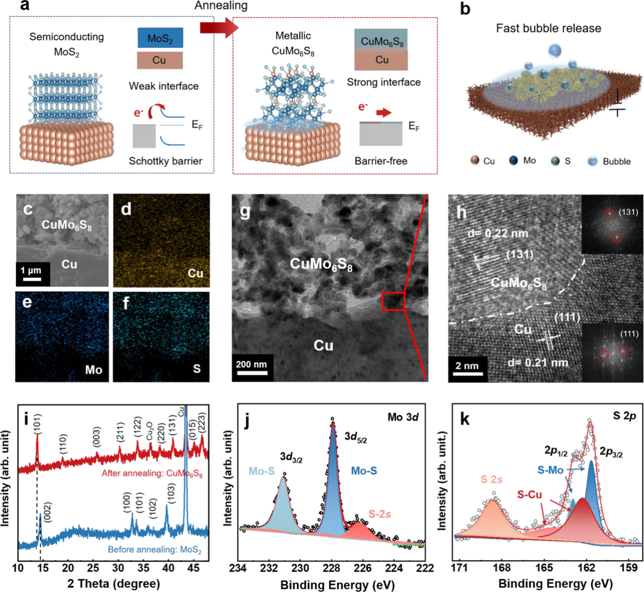 近日,清华大学深圳国际研究生院刘碧录团队创制出一种基于双界面设计的同源金属电极。该电极以优化催化剂与基底以及催化剂与气泡的双界面为出发点,解决了大电流密度制氢下的传质、界面力学、界面电导三大难题。这种同源金属催化剂通过MoS2和Cu的原位高温反应制备,将半导体相MoS2转成具有金属性质的Chevrel相CuMo6S8,这种一体化结构有效消除了半导体-金属接触的界面肖特基势垒。由于电极表面催化剂与基底具有强的化学键结合,且电极展现出全金属性质以及超亲水状态,因此有效提升了催化剂/基底界面结合力并降低了催化剂/气泡界面粘附力,在增强电极稳定性的同时加速了析氢反应的动力学,展现出优异的电催化析氢性能。该电极在2.5 A cm-2下仅需321mV的过电位,在1 A-2.5 A cm-2级别的大电流密度下稳定运行300小时性能无衰减。此外,前驱体MoS2可取自天然矿石辉钼矿,成本比贵金属铂降低2-5个数量级,与目前的大电流密度催化剂相比具有更大的成本优势。
