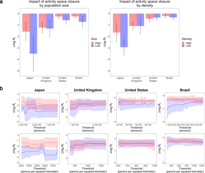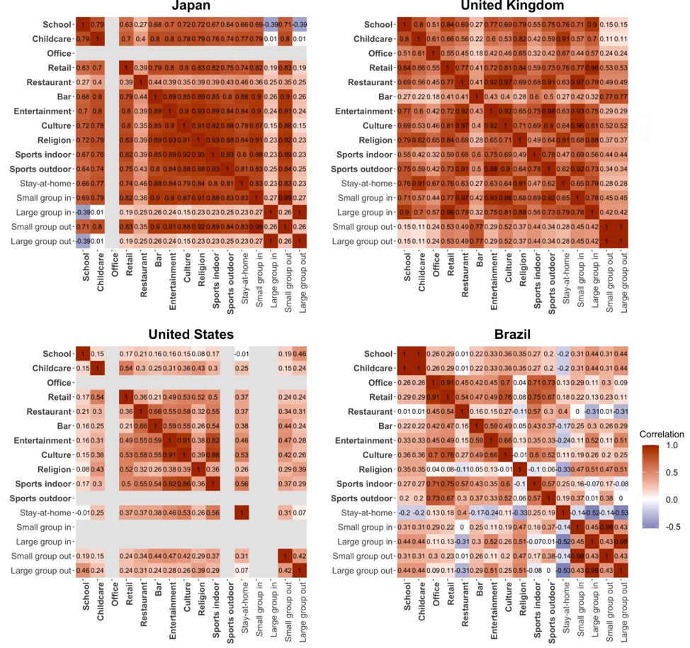 针对这一问题,研究以疫情暴发以来的多国城市作为案例,选取了日本、英国、美国、巴西四国一定人口规模以上的906个城市地区,采集了这些案例在2020年3月至8月实施的活动场所管控政策以及相应的新冠疫情传播数据,形成多国城市级疫情防控政策数据库,收录于牛津新冠政策数据平台(supertracker.spi.ox.ac.uk)。在此基础上,研究分别从场所尺度与城市尺度出发,对11类人群活动场所(包括学校、办公场所、购物场所、餐饮场所等)以及不同规模、密度城市空间中的疫情传播风险进行了评估。