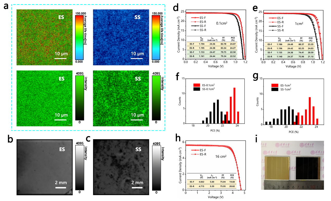 该方法可以制备大面积高效率钙钛矿太阳能电池,并且具备优异的可重复性,为钙钛矿太阳能电池的大规模应用提供了一条有前景的途径。该成果以“真空蒸发和溶液法结合实现高度可重复的大面积高效率钙钛矿太阳能电池”(Combined vacuum evaporation and solution process for high efficiency large-area perovskite solar cells with exceptional reproducibility)为题发表在国际学术期刊《先进材料》(Advanced Materials)上。论文的通讯作者为易陈谊,共同第一作者为2019级博士生谭理国、2018级博士生周俊杰、博士后赵兴,合作者包括国家纳米科学中心丁黎明研究员,瑞士苏黎世应用科技大学沃尔夫冈·特雷斯(Wolfgang Tress)博士和瑞士洛桑联邦理工大学迈克尔·格兰泽尔(Michael Graetzel)教授。工作得到了国家自然科学基金、清华大学自主科研项目、电力系统国家重点实验室自主科研等项目的支持,得到了聚束科技、北京同步辐射1W1A漫散射线站、深圳市立特为智能有限公司的帮助。