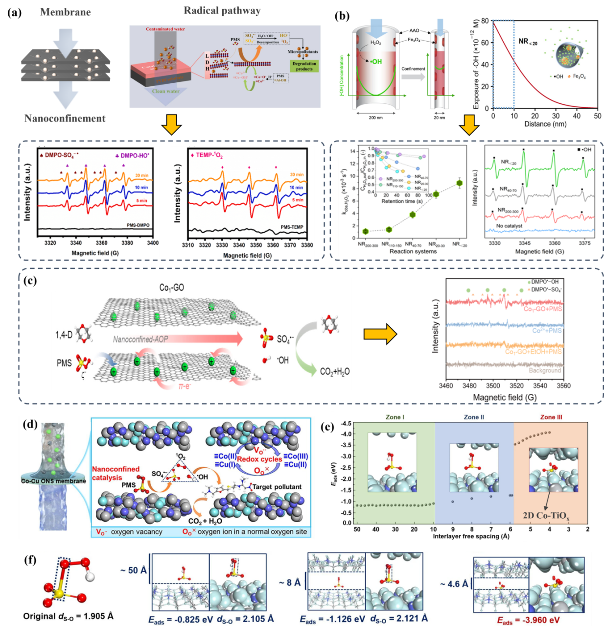 相关工作以“膜法纳米限域催化水处理技术:综述”(Membrane-based nanoconfined heterogeneous catalysis for water purification: A critical review)、“钴功能化石墨相氮化碳纳米片组装的纳米限域催化膜用于快速降解污染物”(Nanoconfined catalytic membranes assembled by cobalt-functionalized graphitic carbon nitride nanosheets for rapid degradation of pollutants)、“膜孔内埃米尺度限域催化实现水净化”(Angstrom-confined catalytic water purification within Co-TiOxlaminar membrane nanochannels)、“超高通量原位功能化的氮化硼膜用于限域催化”(Ultrahigh permeance functionalised boron nitride membrane for nanoconfined heterogeneous catalysis)为题,分别发表在《水研究》(Water Research)、《应用催化B:环境》(Applied Catalysis B: Environmental)、《自然·通讯》(Nature Communications)、《化学·催化》(Chem Catalysis)上。