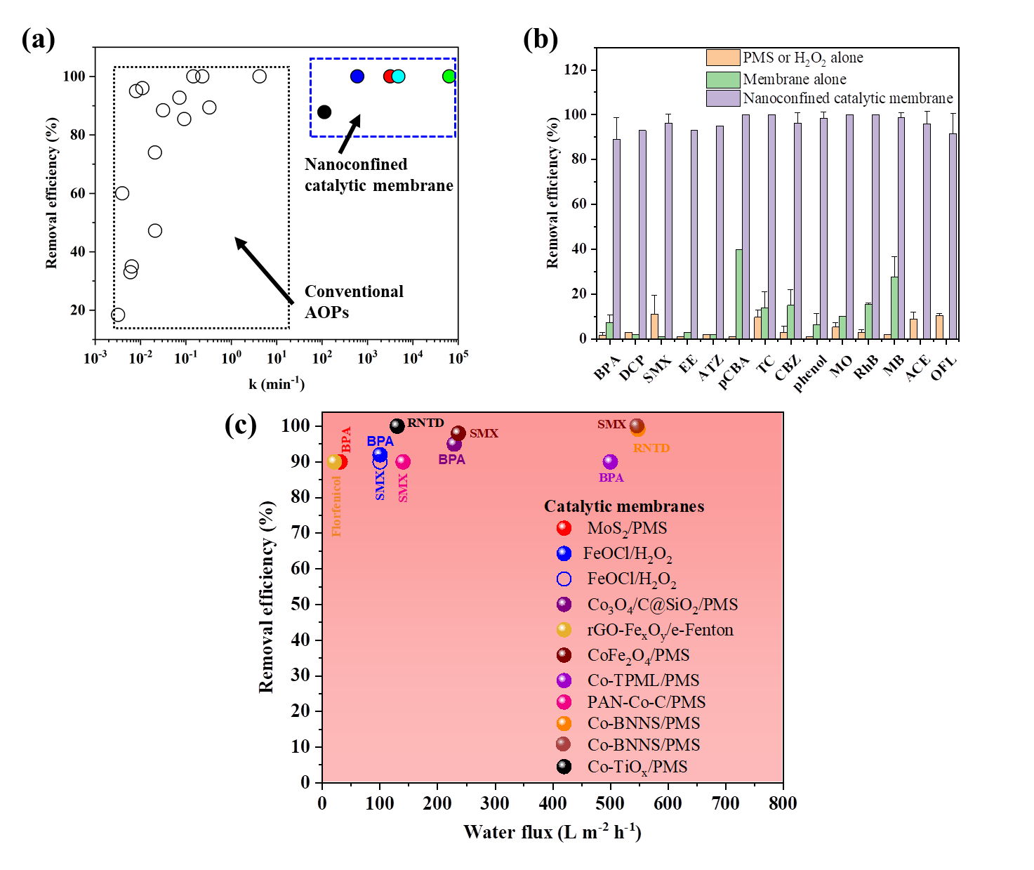 图2 膜法限域催化系统和传统AOPs处理污染物的去除效率 (%) 和速率常数 (k)和不同膜法限域催化系统通量的比较