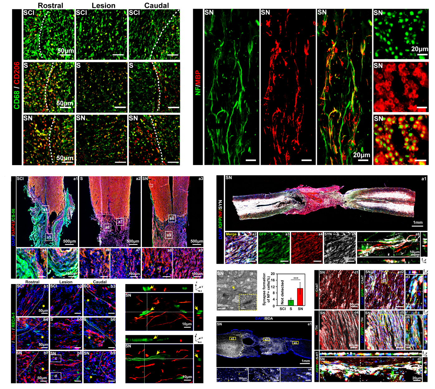 近日,清华大学材料学院王秀梅团队和清华长庚医院神经外科王贵怀主任团队基于生物3D打印技术成功制备了一种有生命的类神经纤维,该纤维由类似于天然细胞外基质的水凝胶包裹着高密度的神经干细胞组成,纤维定向排列并组装为精准适配脊髓损伤区域大小的微型类组织,可作为移植物进行修复治疗(图1)。研究表明,生物水凝胶为神经干细胞提供了一个优异的生长微环境,保障了神经干细胞的原位驻留和高存活,在体外、体内均可分化为功能性神经元(图2)。同时,植入体内的类神经纤维可以显著改善脊髓损伤后的抑制性微环境,炎症细胞从促炎态转变为促再生态,促进神经发生,形成神经突触,重塑神经回路,并有效整合再生神经网络与宿主神经网络(图3),从而显著促进脊髓长距离横断后的运动功能恢复(视频1)。总的来说,此研究利用3D生物打印构建的类神经纤维展现出极其优越的神经再生能力。基于3D生物打印技术的可定制性,该策略可为个性化修复脊髓损伤提供新视角,具有重要意义。