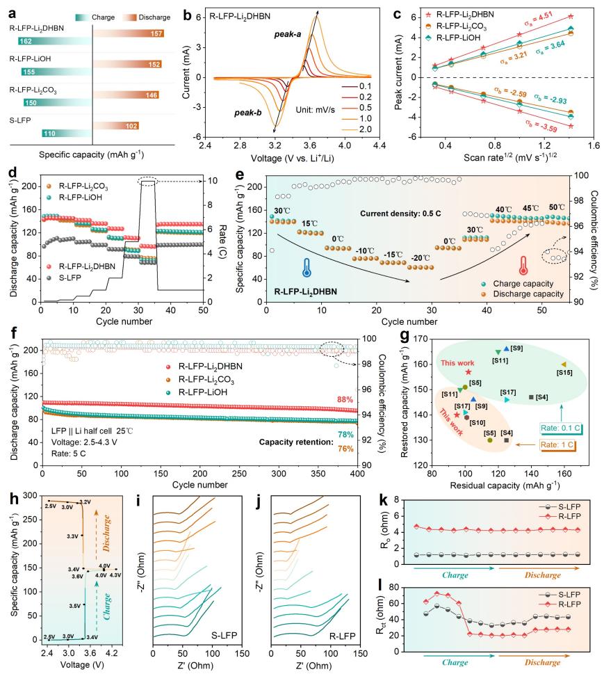 近日,清华大学深圳国际研究生院周光敏、成会明团队提出了使用一种新型的多功能有机锂盐(3,4-二羟基苯腈二锂,Li2DHBN)直接修复失效LFP正极的方法。有机锂盐表面丰富官能团(如-CN,-OLi)可以和失效LFP颗粒有效地耦合,且有机锂盐在较低温度下分解为无定形碳和碳酸锂,在较高温度下进一步分解为氧化锂,即达到“低温包碳+高温补锂”的双重效果。此外,具有还原性的氰基官能团在还原三价铁的过程中起到关键作用。修复后的LFP正极具有优异的循环稳定性和倍率性能,在5C下循环400次后容量保持率为88%,这得益于锂的有效补充、三价铁的还原、电子导电性的提升。这种策略也适用于直接修复过渡金属氧化物层状正极材料,证实了该有机锂盐的通用性。相比于传统的火法和湿法过程,该工作提出的策略具有更高的经济价值和更大的环境效益,为未来探索更多不同锂源用来直接修复失效锂离子电池正极材料提供了独特的思路。