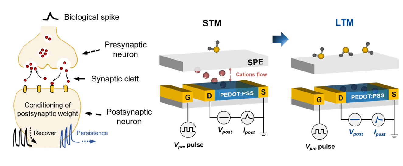图1.基于全固态有机电化学晶体管的柔性仿生嗅觉突触示意图