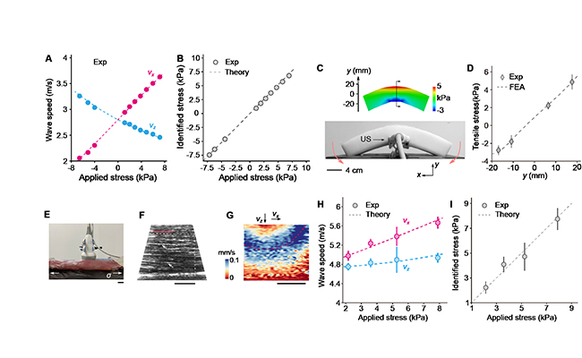 图2.水凝胶和骨骼肌的机械应力成像。(A)受单轴应力的水凝胶中测量得到的两方向上的剪切波速。(B)反演得到的应力和所施加应力的比较。(C)水凝胶的弯曲变形及弯曲应力的有限元计算结果。(D)弯曲应力实验测量与有限元计算的对比。(E)对离体肌肉施加单轴应力。(F)肌肉样品的B超图像。(G)骨骼肌中剪切波的传播。(H)两方向上剪切波速度随应力的变化。(I)肌肉应力实验测量与理论结果的对比