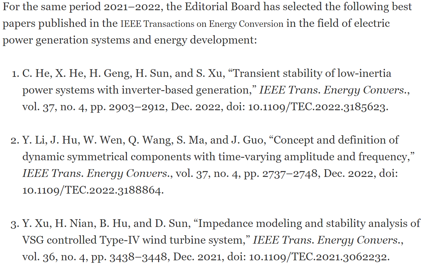 清华新闻网3月24日电 近期,清华大学耿华教授PEACES课题组博士生何长军发表的论文“含电力电子发电装备的低惯量电力系统暂态稳定研究”(Transient Stability of Low-inertia Power Systems With Inverter-Based Generation)获得2022年度《IEEE能源转换汇刊》(IEEE Transactions on Energy Conversion)最佳论文奖,且在所有获奖论文中排名第一。同时,何长军也获得了2022年度优秀审稿人称号。