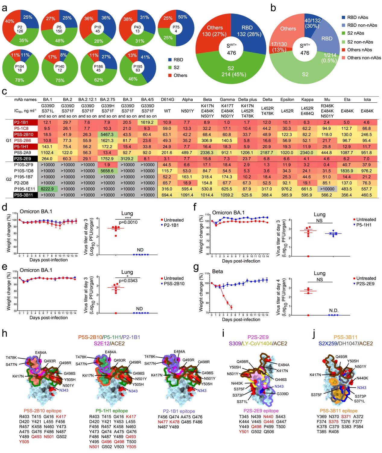 该研究以这几个关键问题为切入点,从9名新冠原始株病毒感染康复者中分离到476株S蛋白特异性单克隆抗体,其中45%是结合S2表位抗体,而结合RBD和其他表位抗体各占不足30%(图1a);然而,假病毒中和实验发现,大多数中和抗体主要来自于RBD抗体(30%, 40/132),NTD抗体次之(17/130),而S2抗体最少(1/214)(图1b),说明RBD是诱导中和抗体的关键抗原组分。研究人员重点评估了40株RBD抗体的广谱中和能力,13株RBD抗体能够保持对Beta和Delta等重要突变株的中和能力,但随着Omicron突变株的出现,其中6株抗体失去了中和能力。但惊奇的是,仍然有7株抗体能够中和所有的突变株,说明新冠病毒原始株感染形成的免疫印迹确实具备对抗新冠病毒突变逃逸的潜力。基因分析发现高活性的广谱中和抗体偏好使用IGHV3-53家系,再次突出了这类“公共抗体”的重要性(图1c)。动物保护实验显示4株代表性的广谱中和抗体(P2-1B1, P5S-2B10, P5-1H1, P2S-2E9)能够有效抑制Omicron BA.1和Beta突变株活毒的感染(图1d-g)。结构分析显示广谱中和抗体识别病毒的不同表位,能够一定程度耐受其作用位点发生突变,P5S-2B10、P5-1H1、P2-1B1属于经典的Class 1抗体,模仿和直接竞争ACE2受体识别病毒RBD蛋白,P2S-2E9属于Class 3抗体,P5S-3B11属于Class 4抗体(图1h-j)。该研究明确回答了3个重要科学问题:1)新冠原始株病毒感染能够诱导超级广谱的中和抗体;2)RBD蛋白依旧是诱导广谱高效中和抗体的理想靶标;3)模仿受体结合和IGHV3-53家系偏好的中和抗体发挥重要作用。